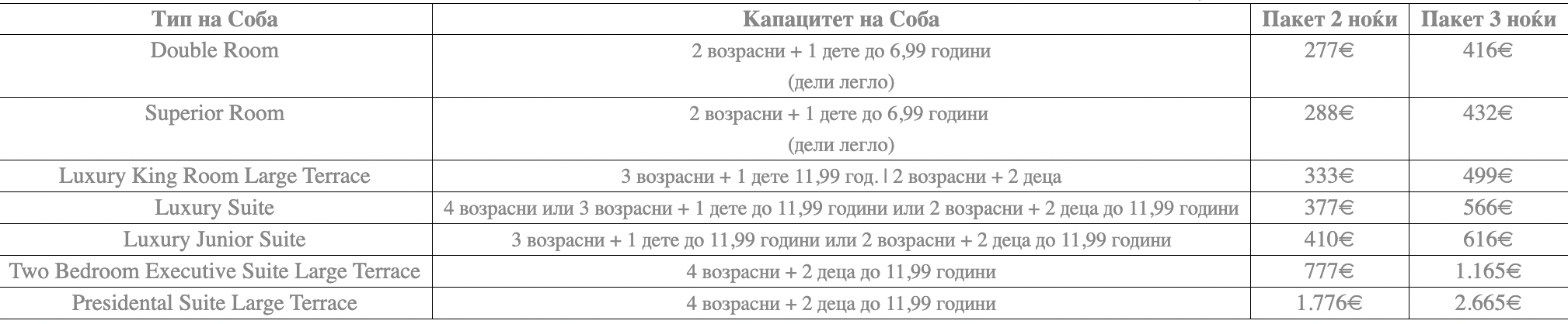 Цените се дадени по соба (за 2 лица) за пакет од 2 и 3 ноќи на база Ноќевање со Појадок