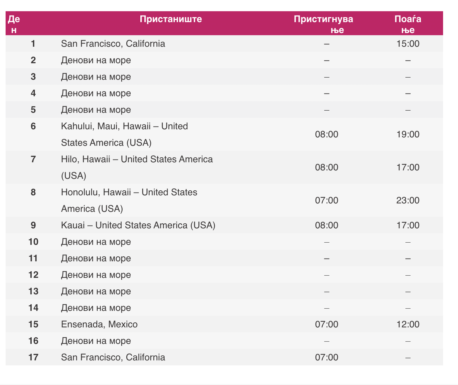 | 07.12.2026 | Kauai (Nawiliwili), Hawaii Четвртиот по големина остров во хавајската група, Кауаи е познат како „Градинскиот остров“. Теренот се движи од вулканските падини на планината Вајалеале и пустинската убавина на кањонот Ваимеа до раскошното папрат Грото на реката Ваилуа. Иронично, овој некогаш изолиран остров беше местото на првата средба меѓу Европејците и Хавајците. На 19 јануари 1778 година, капетанот Џејмс Кук ги закотви своите бродови од устието на реката Ваимеа, станувајќи првиот во долгата низа ентузијастички посетители.