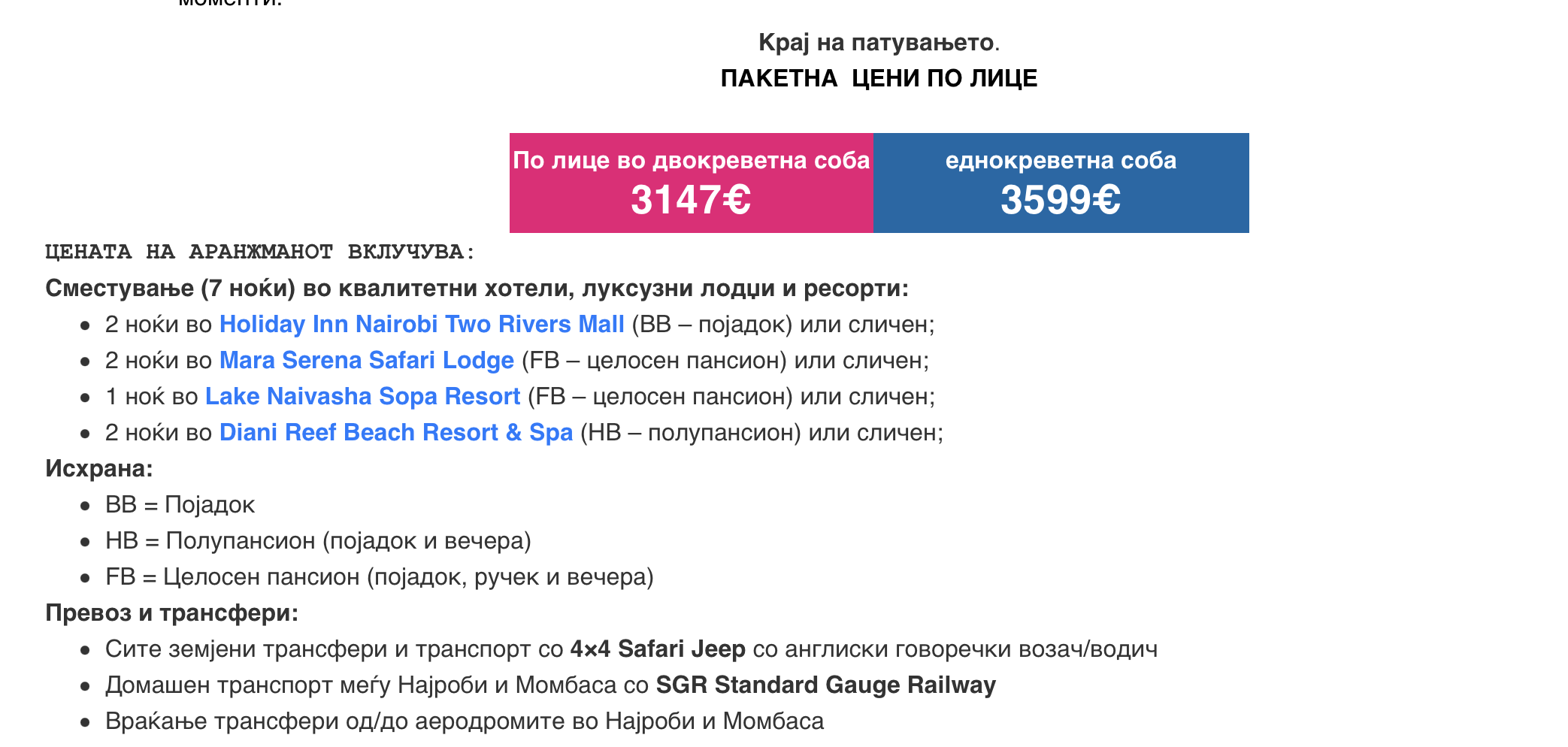 | 05.10.2026 | Најроби (појадок и вечера)- Масаи Мара