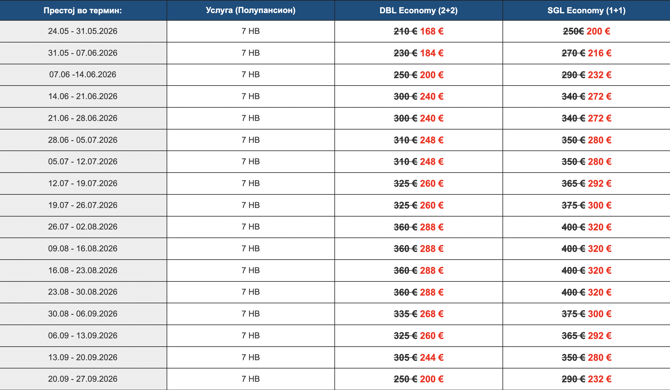 Цените се дадени по лице, за сместување на минимум 2 возрасни лица во DBL соба, 1 возрасно лице во SGL соба .