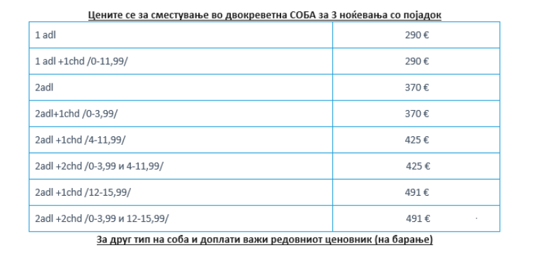 | Двокреветна соба (брачен кревет) | 2 возрасни + 1 дете до 15.99г. + 1 дете до 3.99г |