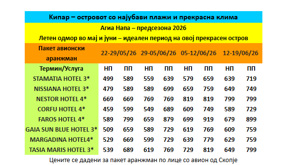 – 7 ноќевања со појадок НП или полупансион ПП во  хотел по избор во Агиа Напа