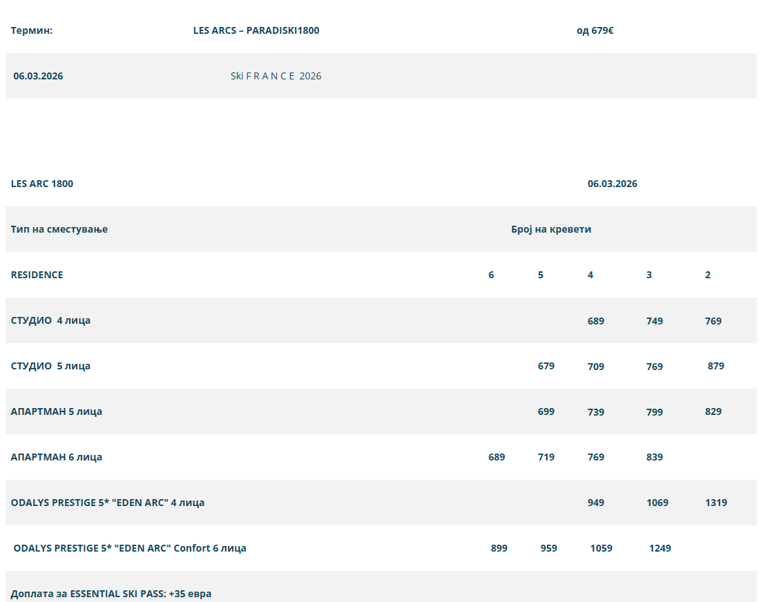 - Дадената цена е Пакет цена по лице во зависнот од бројот на лица и тип на сместување, за максимално даден број на лица во студио и апартман, за 7 ноќевања, 6 дневна стандардна ски карта и вклучен автобуски превоз.
