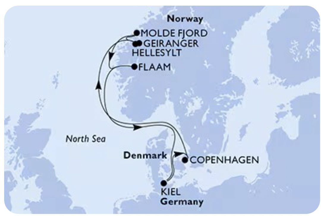 Впловување во 07:00 часот.И покрај неговата северна локација, пристаништето Молде ужива во релативно блага клима поради топлиот Атлантски Заливски поток и заштитената планинска локација на градот. Шармантниот град Молде е благословен со бујна вегетација и е познат и како „Град на розите“.Испловување во 16:00 часот.