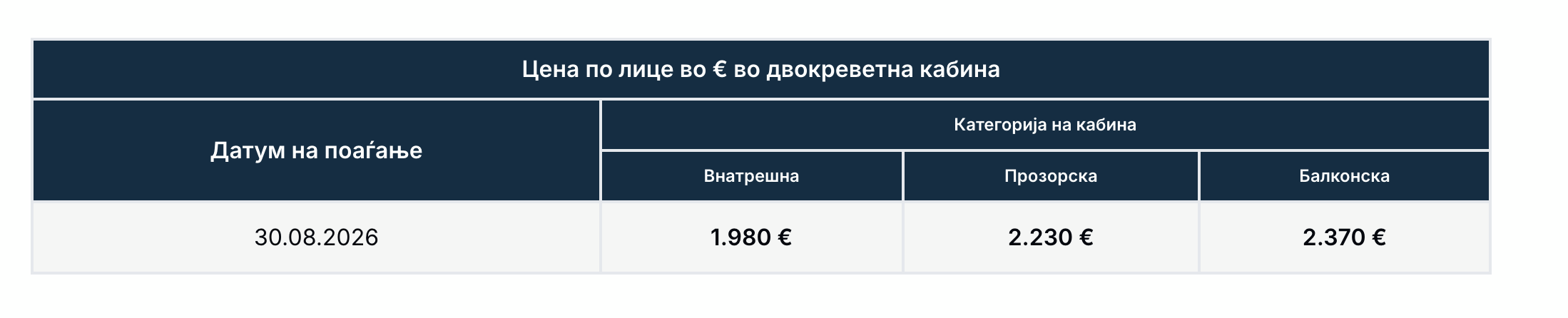 Впловување во 08:00Симнување од брод. Разглед на градот. Ручек. Трансфер до аеродром. Полетување за Виена во 20:00 часот. Слетување во Виена во 21:40 часот. Полетување за Скопје во 22:45 часот. Слетување во Скопје 00:15 часот (на 07.09.2026).