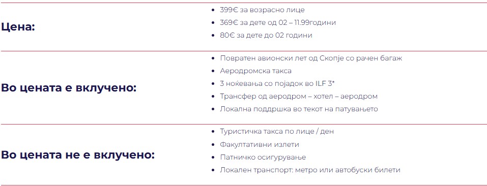 • Организаторот на патувањето го задржува правото да ги понуди и продаде слободните места по специјални “ultrafirst” или “last minute” понуди, по цени кои може да се разликуваат од веќе објавените.
