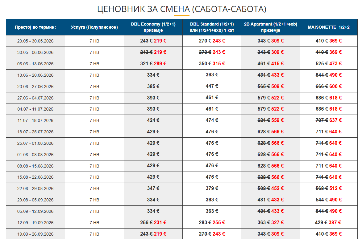 Во период од 23.05 – 19.09.2026 за смена (САБОТА – САБОТА)