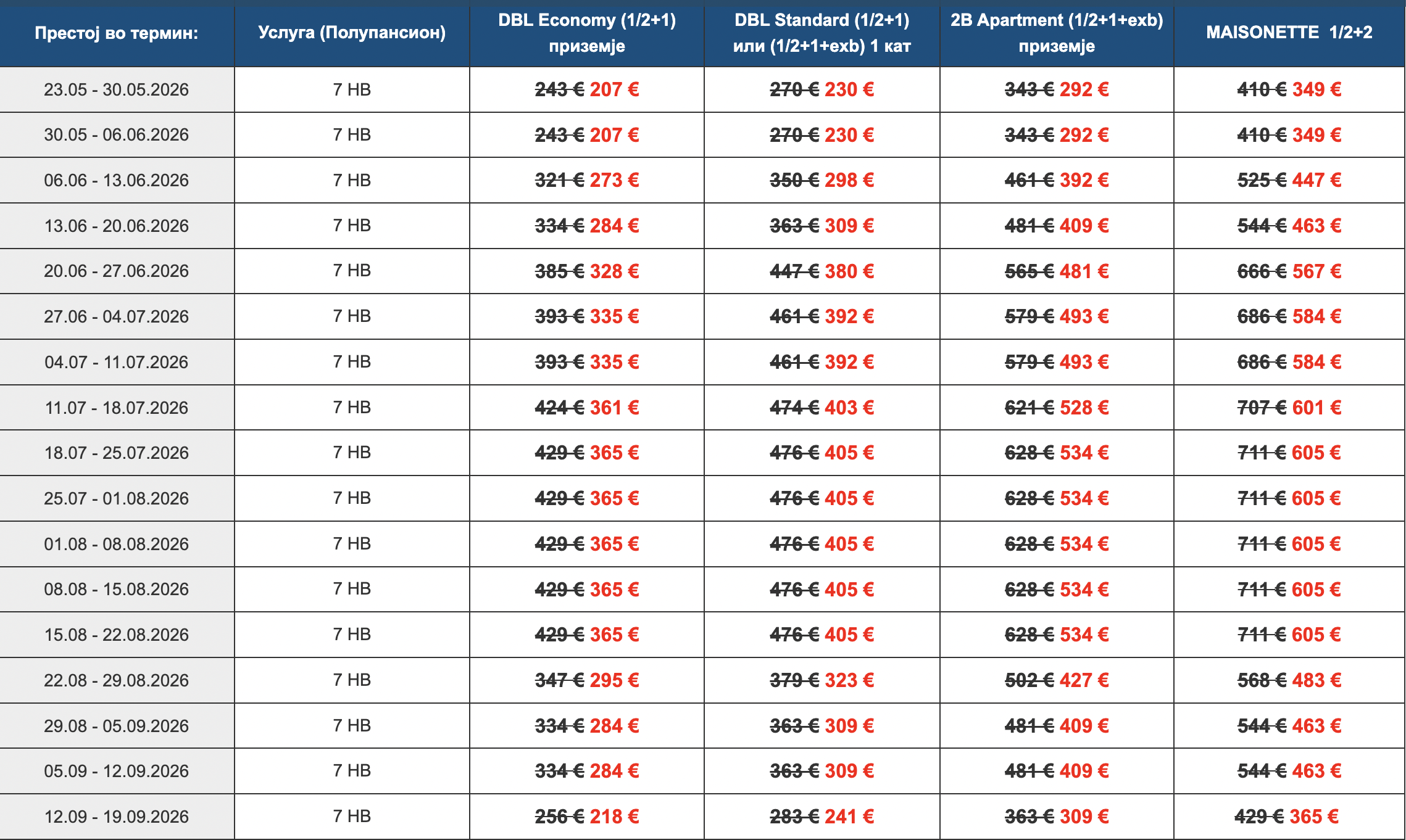 Цените се дадени по лице, за сместување на минимум 2 возрасни лица во соба.