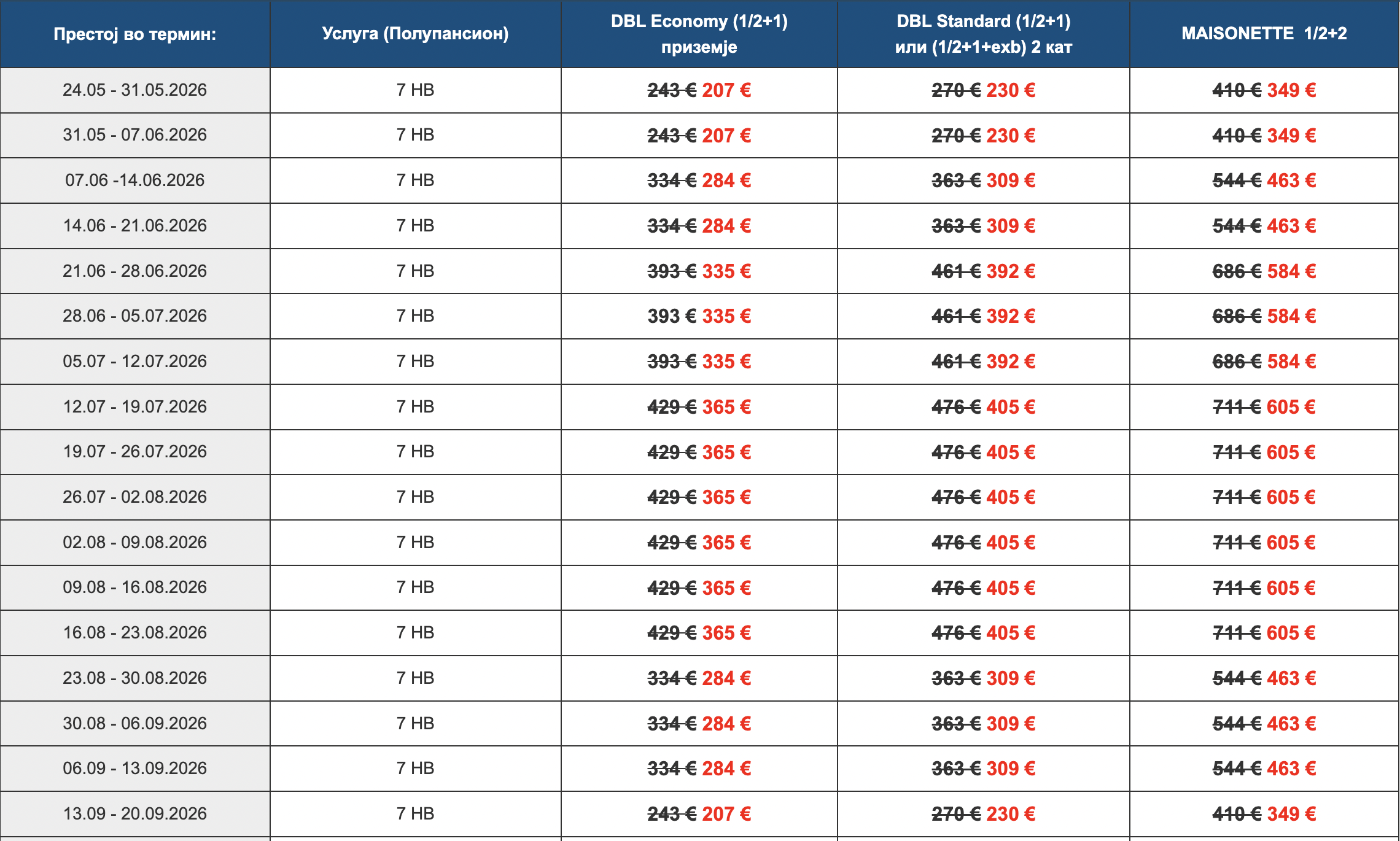 * Доплата за дополнително дете 2-5.99 години во соба – 105 € (7 полупансиони)