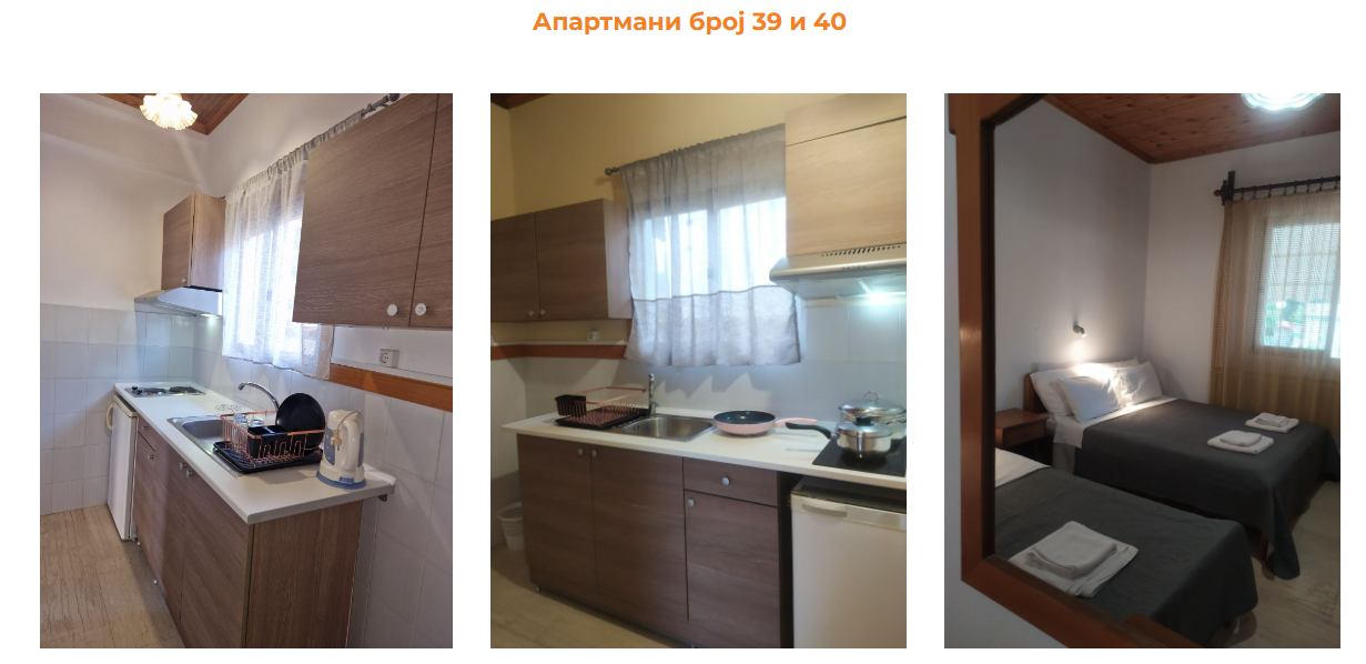 1/3 апартмани број 39 и 40 – Приземје – мала зграда. Располагаат со брачен кревет + 1 стандарден единечен кревет. Апартманите имаат нова кујна со сите потребни елементи (мал фрижидер, плотна за готвење и електричен бокал за вода), клима, ТВ, фен за коса, тоалет со када и сушара. Имаат сопствена трем – тераса која гледа кон дворот на вилата.