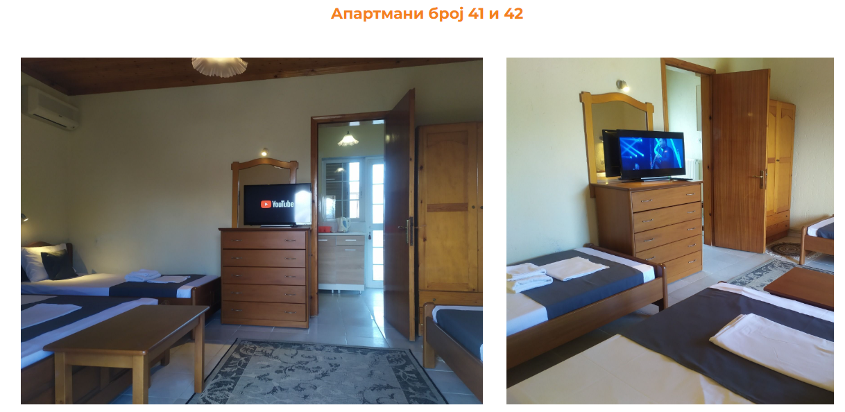 1/4 апартмани број 41 и 42 – Прв кат – мала зграда. Располагаат со брачен кревет + 2 единечни стандардни кревети. Апартманите имаат нова кујна со сите потребни елементи (мал фрижидер, плотна за готвење и електричен бокал за вода), клима, ТВ, фен за коса, тоалет со туш и сушара. Имаат сопствена тераса опремена со маса и столови која гледа кон дворот на вилата.