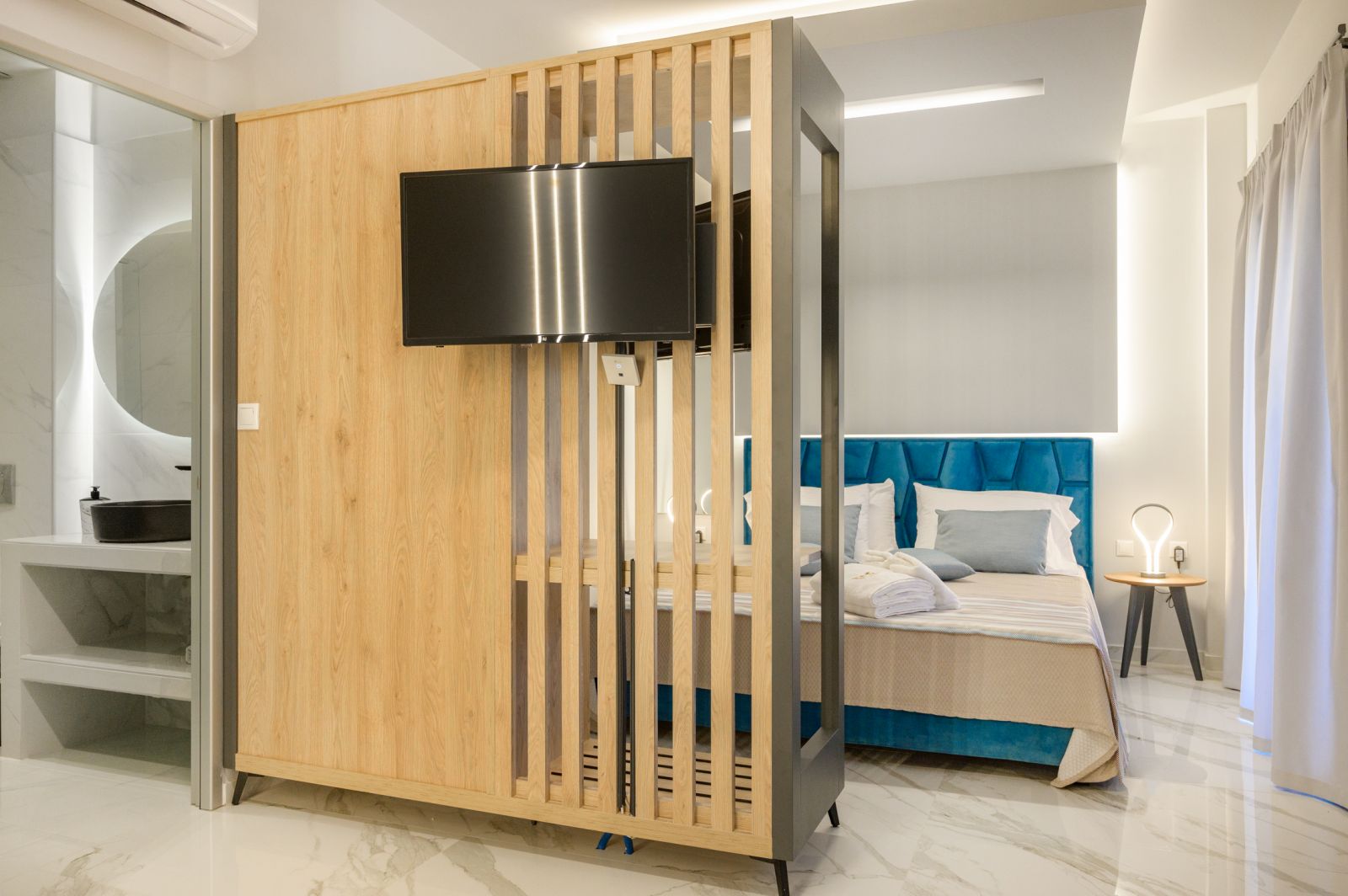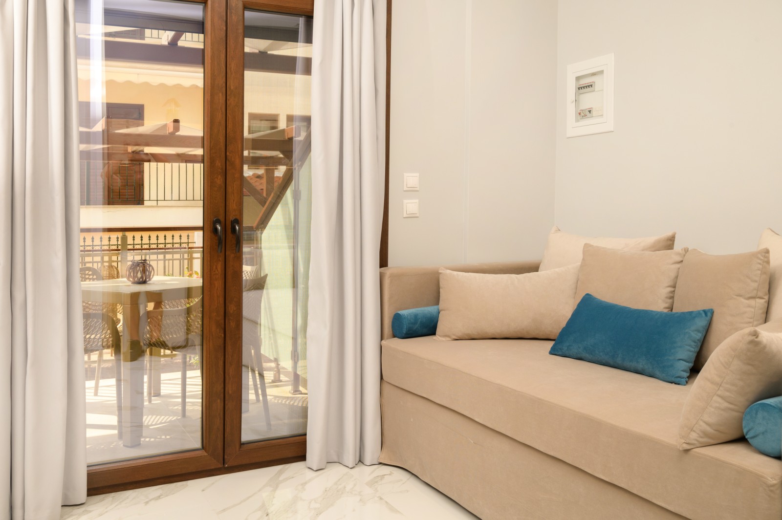Студио бр.4 – располага со голем брачен кревет и дупла софа на пуштање. Во ова студио може да се сместат максимум 2 возрасни лица и 2 деца до 12 години или 4 возрасни лица. (Turquoise color/back на сликите)