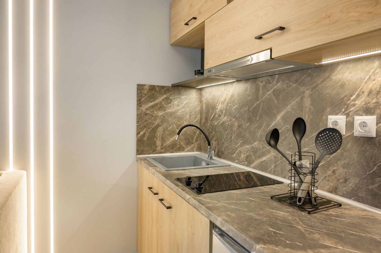 Студио бр.1 – располага со голем брачен кревет и софа која не се пушта. Во ова студио може да се сместат максимум 2 возрасни лица и 2 деца до 10 години или 3 возрасни лица. (Purple color/front на сликите)