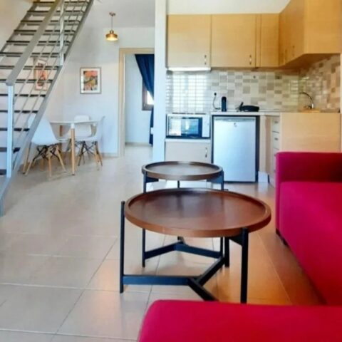 1/5 мезонет апартман – број 1 – се наоѓа на втор спрат со директен поглед на море (дневна со црвена боја и спална со тиркизна боја на сликите). Дневен престој со аголна гарнитура која се пушта, трпезарија, кујна, тоалет, балкон и посебна просторија со брачен кревет. Скалите водат до спална со два големи единечни споени кревети. Во овој мезонет може да се сместат максимум 5 возрасни лица и 1 дете до 12 години.
